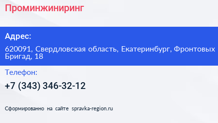 Проминжиниринг по адресу 620091, Свердловская область, Екатеринбург, Фронтовых Бригад, 18 в дальнейшем Организация, размещена в следующих категориях: