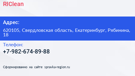 RIClean по адресу 620105, Свердловская область, Екатеринбург, Рябинина, 18 в дальнейшем Организация, размещена в следующих категориях: