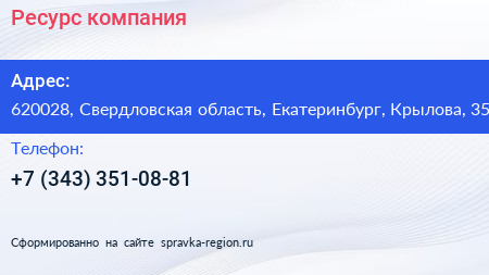 Ресурс, компания по адресу 620028, Свердловская область, Екатеринбург, Крылова, 35 в дальнейшем Организация, размещена в следующих категориях: