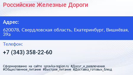 Российские Железные Дороги по адресу 620078, Свердловская область, Екатеринбург, Вишнёвая, 39а в дальнейшем Организация, размещена в следующих категориях: