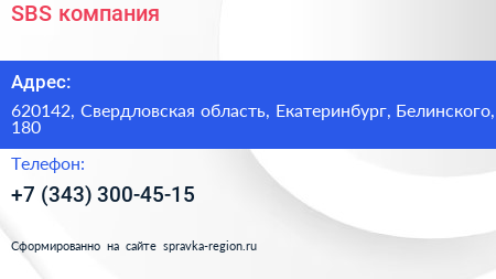 SBS, компания по адресу 620142, Свердловская область, Екатеринбург, Белинского, 180 в дальнейшем Организация, размещена в следующих категориях: