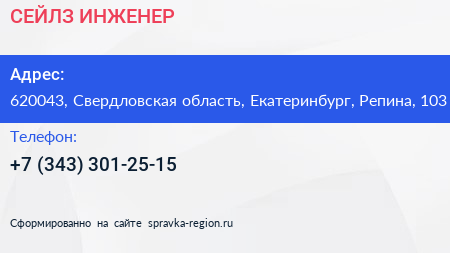 СЕЙЛЗ ИНЖЕНЕР по адресу 620043, Свердловская область, Екатеринбург, Репина, 103 в дальнейшем Организация, размещена в следующих категориях: