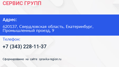 СЕРВИС ГРУПП по адресу 620137, Свердловская область, Екатеринбург, Промышленный проезд, 9 в дальнейшем Организация, размещена в следующих категориях: