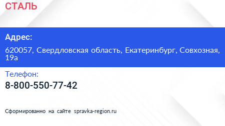 СТАЛЬ по адресу 620057, Свердловская область, Екатеринбург, Совхозная, 19а в дальнейшем Организация, размещена в следующих категориях: