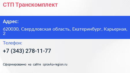 СТП Транскомплект по адресу 620030, Свердловская область, Екатеринбург, Карьерная, 2 в дальнейшем Организация, размещена в следующих категориях: