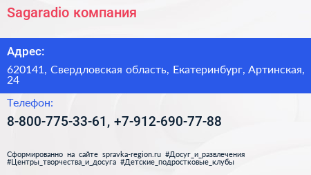 Sagaradio, компания по адресу 620141, Свердловская область, Екатеринбург, Артинская, 24 в дальнейшем Организация, размещена в следующих категориях: