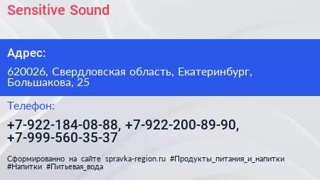 Sensitive Sound по адресу 620026, Свердловская область, Екатеринбург, Большакова, 25 в дальнейшем Организация, размещена в следующих категориях: