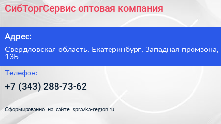 СибТоргСервис, оптовая компания по адресу Свердловская область, Екатеринбург, Западная промзона, 13Б в дальнейшем Организация, размещена в следующих категориях: