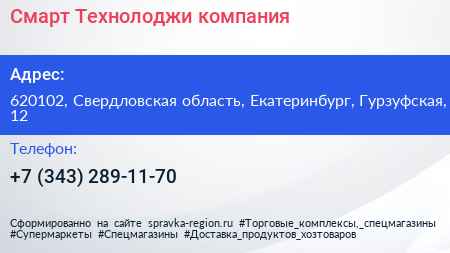 Смарт-Технолоджи, компания по адресу 620102, Свердловская область, Екатеринбург, Гурзуфская, 12 в дальнейшем Организация, размещена в следующих категориях: