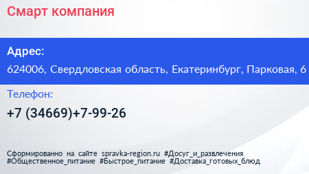 Смарт, компания по адресу 624006, Свердловская область, Екатеринбург, Парковая, 6 в дальнейшем Организация, размещена в следующих категориях:
