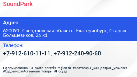 SoundPark по адресу 620091, Свердловская область, Екатеринбург, Старых Большевиков, 2а к1 в дальнейшем Организация, размещена в следующих категориях: