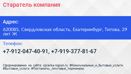 Старатель, компания по адресу 620085, Свердловская область, Екатеринбург, Титова, 29 лит Ж в дальнейшем Организация, размещена в следующих категориях: