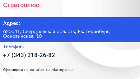 Стратоплюс по адресу 620041, Свердловская область, Екатеринбург, Основинская, 10 в дальнейшем Организация, размещена в следующих категориях: