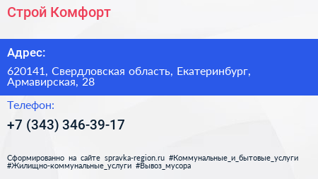 Строй-Комфорт по адресу 620141, Свердловская область, Екатеринбург, Армавирская, 28 в дальнейшем Организация, размещена в следующих категориях: