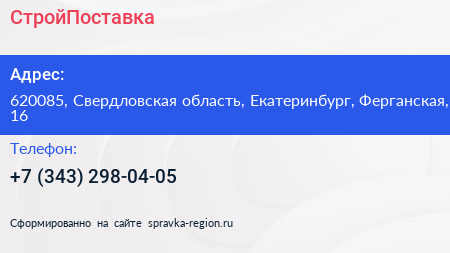 СтройПоставка по адресу 620085, Свердловская область, Екатеринбург, Ферганская, 16 в дальнейшем Организация, размещена в следующих категориях: