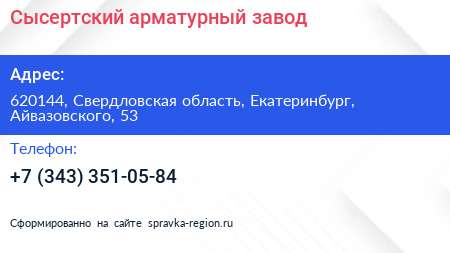 Сысертский арматурный завод по адресу 620144, Свердловская область, Екатеринбург, Айвазовского, 53 в дальнейшем Организация, размещена в следующих категориях:
