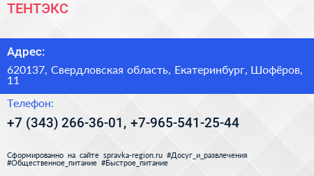 ТЕНТЭКС по адресу 620137, Свердловская область, Екатеринбург, Шофёров, 11 в дальнейшем Организация, размещена в следующих категориях: