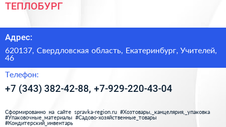 ТЕПЛОБУРГ по адресу 620137, Свердловская область, Екатеринбург, Учителей, 46 в дальнейшем Организация, размещена в следующих категориях: