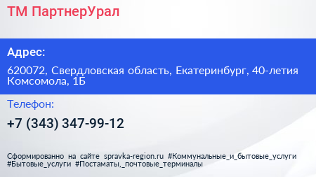 ТМ-ПартнерУрал по адресу 620072, Свердловская область, Екатеринбург, 40-летия Комсомола, 1Б в дальнейшем Организация, размещена в следующих категориях: