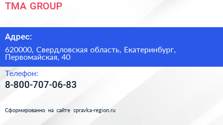 TMA GROUP по адресу 620000, Свердловская область, Екатеринбург, Первомайская, 40 в дальнейшем Организация, размещена в следующих категориях: