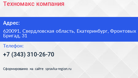 Техномакс, компания по адресу 620091, Свердловская область, Екатеринбург, Фронтовых Бригад, 31 в дальнейшем Организация, размещена в следующих категориях: