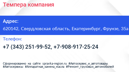 Для связи с организацией воспользуйтесь номером телефона: +7 (343) 251-99-52, +7-908-917-25-24. Пн: c 09:00-19:00, Вт: c 09:00-19:00, Ср: c 09:00-19:00, Чт: c 09:00-19:00, Пт: c 09:00-19:00, Сб: c 10:00-15:00, Вс: выходной, вы можете обратиться в эту организацию.