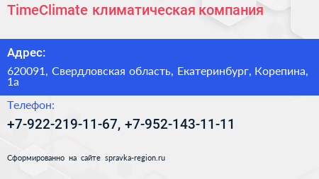 TimeClimate, климатическая компания по адресу 620091, Свердловская область, Екатеринбург, Корепина, 1а в дальнейшем Организация, размещена в следующих категориях: