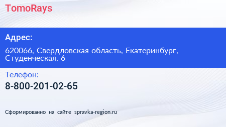 TomoRays по адресу 620066, Свердловская область, Екатеринбург, Студенческая, 6 в дальнейшем Организация, размещена в следующих категориях: