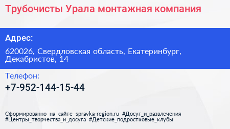 Трубочисты Урала, монтажная компания по адресу 620026, Свердловская область, Екатеринбург, Декабристов, 14 в дальнейшем Организация, размещена в следующих категориях: