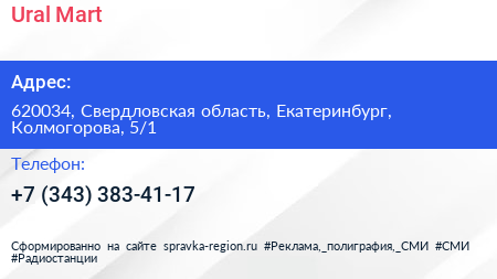Ural Mart по адресу 620034, Свердловская область, Екатеринбург, Колмогорова, 5/1 в дальнейшем Организация, размещена в следующих категориях:
