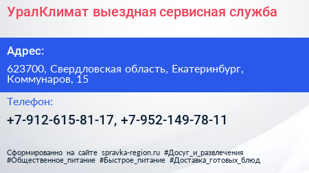 УралКлимат, выездная сервисная служба по адресу 623700, Свердловская область, Екатеринбург, Коммунаров, 15 в дальнейшем Организация, размещена в следующих категориях: