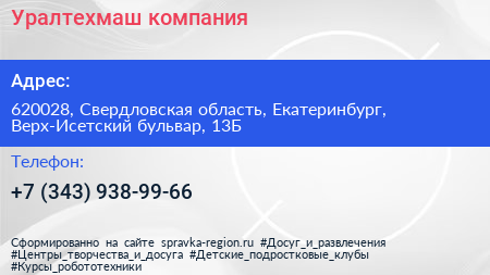 Для связи с организацией воспользуйтесь номером телефона: +7 (343) 938-99-66. Пн: c 09:00-18:00, Вт: c 09:00-18:00, Ср: c 09:00-18:00, Чт: c 09:00-18:00, Пт: c 09:00-18:00, Сб: выходной, Вс: выходной, вы можете обратиться в эту организацию.