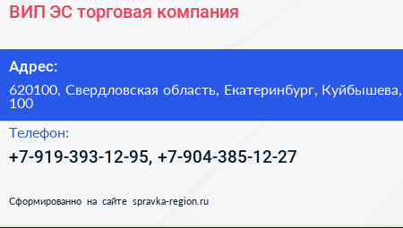 ВИП-ЭС, торговая компания по адресу 620100, Свердловская область, Екатеринбург, Куйбышева, 100 в дальнейшем Организация, размещена в следующих категориях: