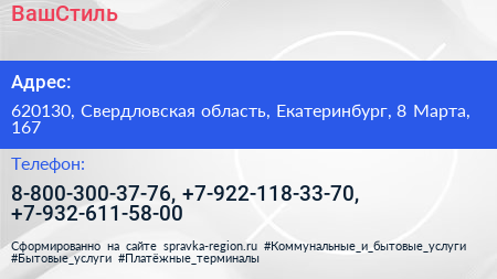 ВашСтиль по адресу 620130, Свердловская область, Екатеринбург, 8 Марта, 167 в дальнейшем Организация, размещена в следующих категориях: