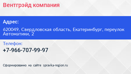 Вентгрэйд, компания по адресу 620049, Свердловская область, Екатеринбург, переулок Автоматики, 2 в дальнейшем Организация, размещена в следующих категориях: