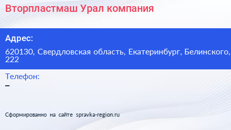 Вторпластмаш Урал, компания по адресу 620130, Свердловская область, Екатеринбург, Белинского, 222 в дальнейшем Организация, размещена в следующих категориях:
