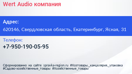 Wert Audio, компания по адресу 620146, Свердловская область, Екатеринбург, Ясная, 31 в дальнейшем Организация, размещена в следующих категориях: