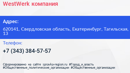 WestWerk, компания по адресу 620141, Свердловская область, Екатеринбург, Тагильская, 13 в дальнейшем Организация, размещена в следующих категориях: