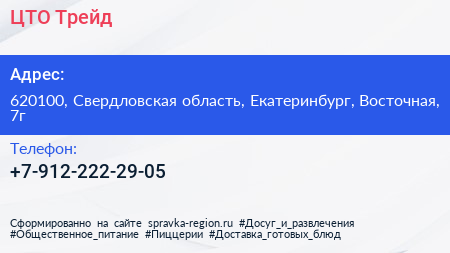 ЦТО Трейд по адресу 620100, Свердловская область, Екатеринбург, Восточная, 7г в дальнейшем Организация, размещена в следующих категориях: