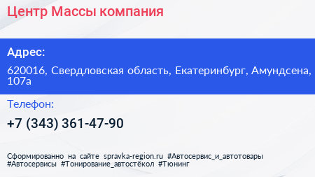 Центр Массы, компания по адресу 620016, Свердловская область, Екатеринбург, Амундсена, 107а в дальнейшем Организация, размещена в следующих категориях: