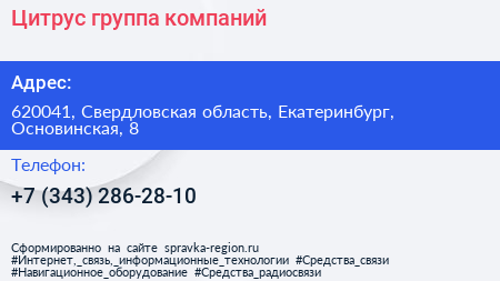 Цитрус, группа компаний по адресу 620041, Свердловская область, Екатеринбург, Основинская, 8 в дальнейшем Организация, размещена в следующих категориях: