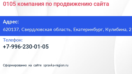 0105, компания по продвижению сайта по адресу 620137, Свердловская область, Екатеринбург, Кулибина, 2 в дальнейшем Организация, размещена в следующих категориях:
