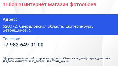 1rulon.ru, интернет-магазин фотообоев по адресу 620072, Свердловская область, Екатеринбург, Бетонщиков, 5 в дальнейшем Организация, размещена в следующих категориях: