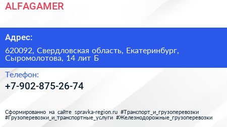 ALFAGAMER по адресу 620092, Свердловская область, Екатеринбург, Сыромолотова, 14 лит Б в дальнейшем Организация, размещена в следующих категориях: