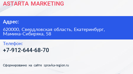 ASTARTA.MARKETING по адресу 620000, Свердловская область, Екатеринбург, Мамина-Сибиряка, 58 в дальнейшем Организация, размещена в следующих категориях: