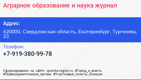 Аграрное образование и наука, журнал по адресу 620000, Свердловская область, Екатеринбург, Тургенева, 23 в дальнейшем Организация, размещена в следующих категориях: