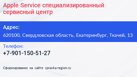 Apple Service, специализированный сервисный центр по адресу 620100, Свердловская область, Екатеринбург, Ткачей, 13 в дальнейшем Организация, размещена в следующих категориях: