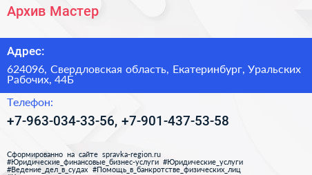 Архив-Мастер по адресу 624096, Свердловская область, Екатеринбург, Уральских Рабочих, 44Б в дальнейшем Организация, размещена в следующих категориях:
