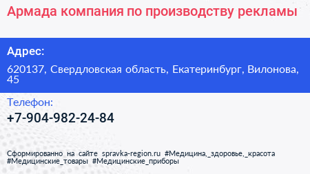 Армада, компания по производству рекламы по адресу 620137, Свердловская область, Екатеринбург, Вилонова, 45 в дальнейшем Организация, размещена в следующих категориях: