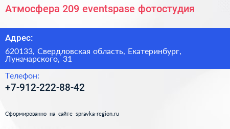 Атмосфера 209 eventspase, фотостудия по адресу 620133, Свердловская область, Екатеринбург, Луначарского, 31 в дальнейшем Организация, размещена в следующих категориях: